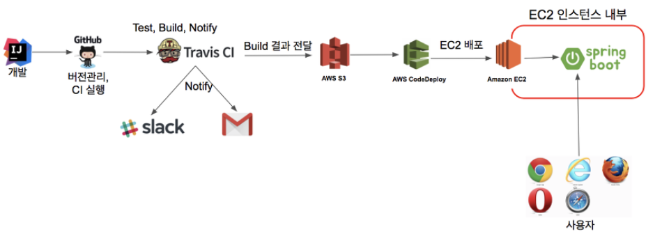 예를 들어, CI는 깃허브에서 제공하는 무료 CI 서비스인 Travis CI를, CD는 AWS CodeDeploy를 사용해보자.