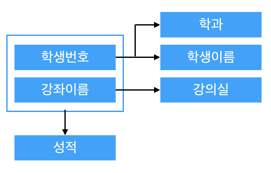 이제껏 봐왔던 학생수강성적정보 릴레이션에는 학생정보 (학생번호, 학생이름, 학과)와 강좌정보 (강좌이름, 강의실)이 한 릴레이션에 모두 포함되어있기 때문에 이상현상이 나타난다.