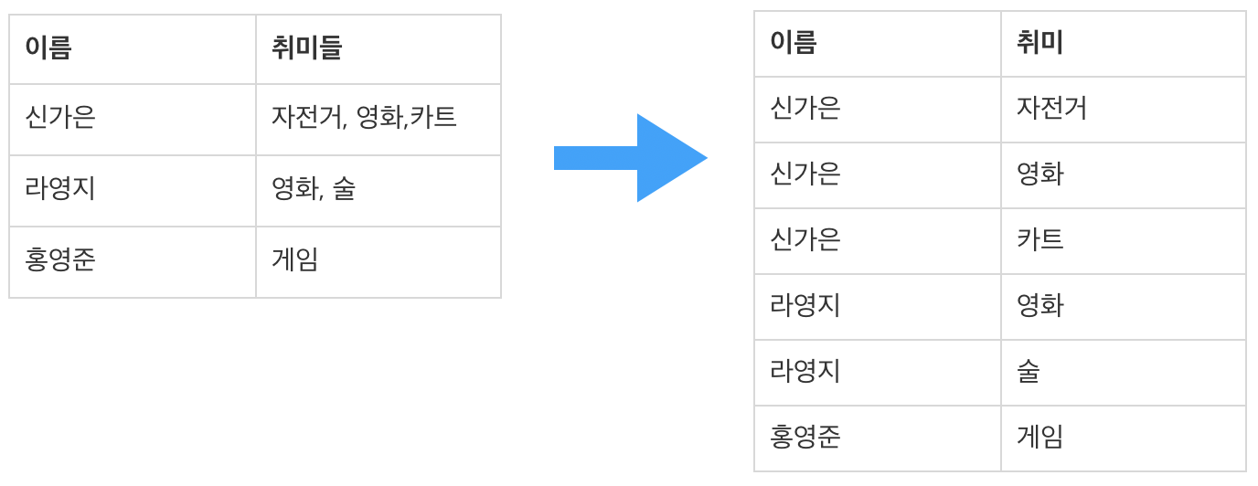 친구취미들 (이름, 취미들) 릴레이션을 친구취미 (이름, 취미) 릴레이션으로 바꾸어 저장하였다.