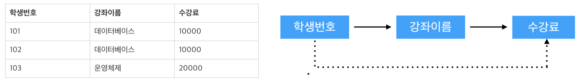 '강좌이름,'수강료'는 모두 기본키에 함수적으로 종속되어 있다.