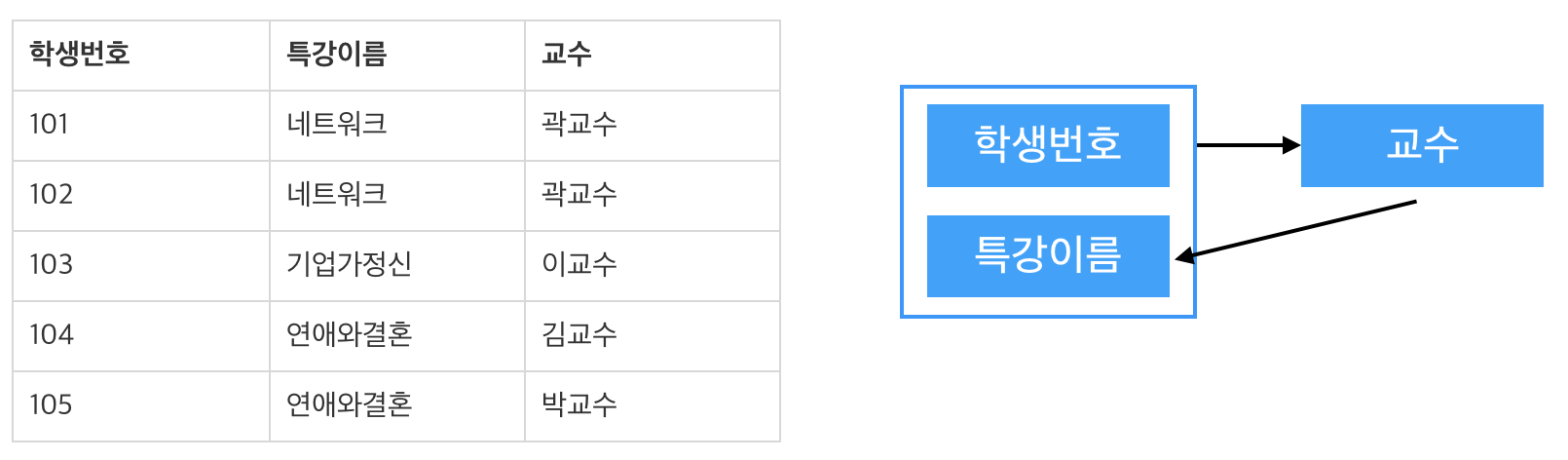 '(학생번호, 특강이름) -> 교수', '교수->특강이름' 관계가 성립한다. (교수는 한 특강만 담당한다고 가정했음.)