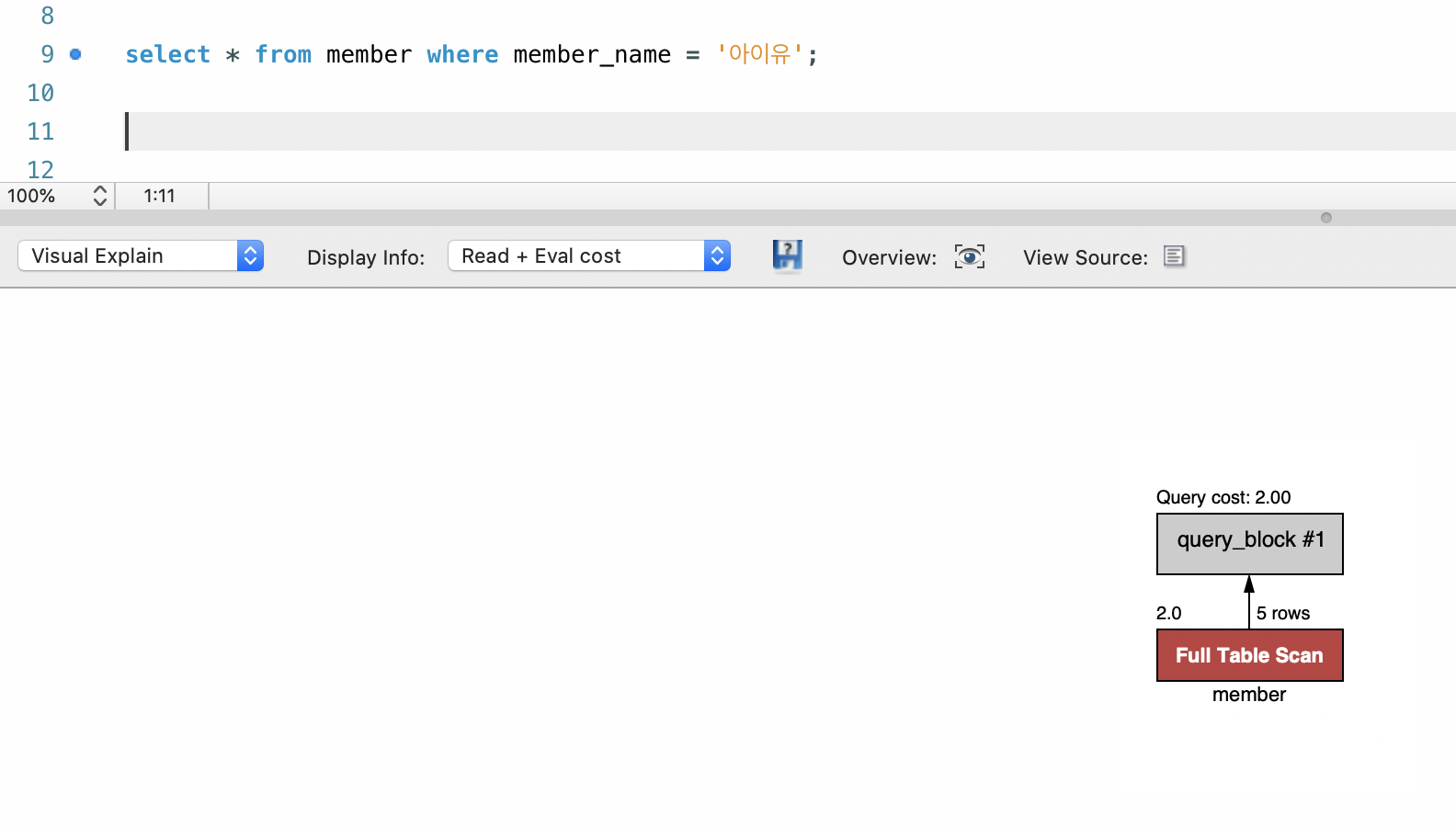 예를 들어, 회원테이블 member에서 member_name이 아이유인 데이터를 조회한다고 하자.