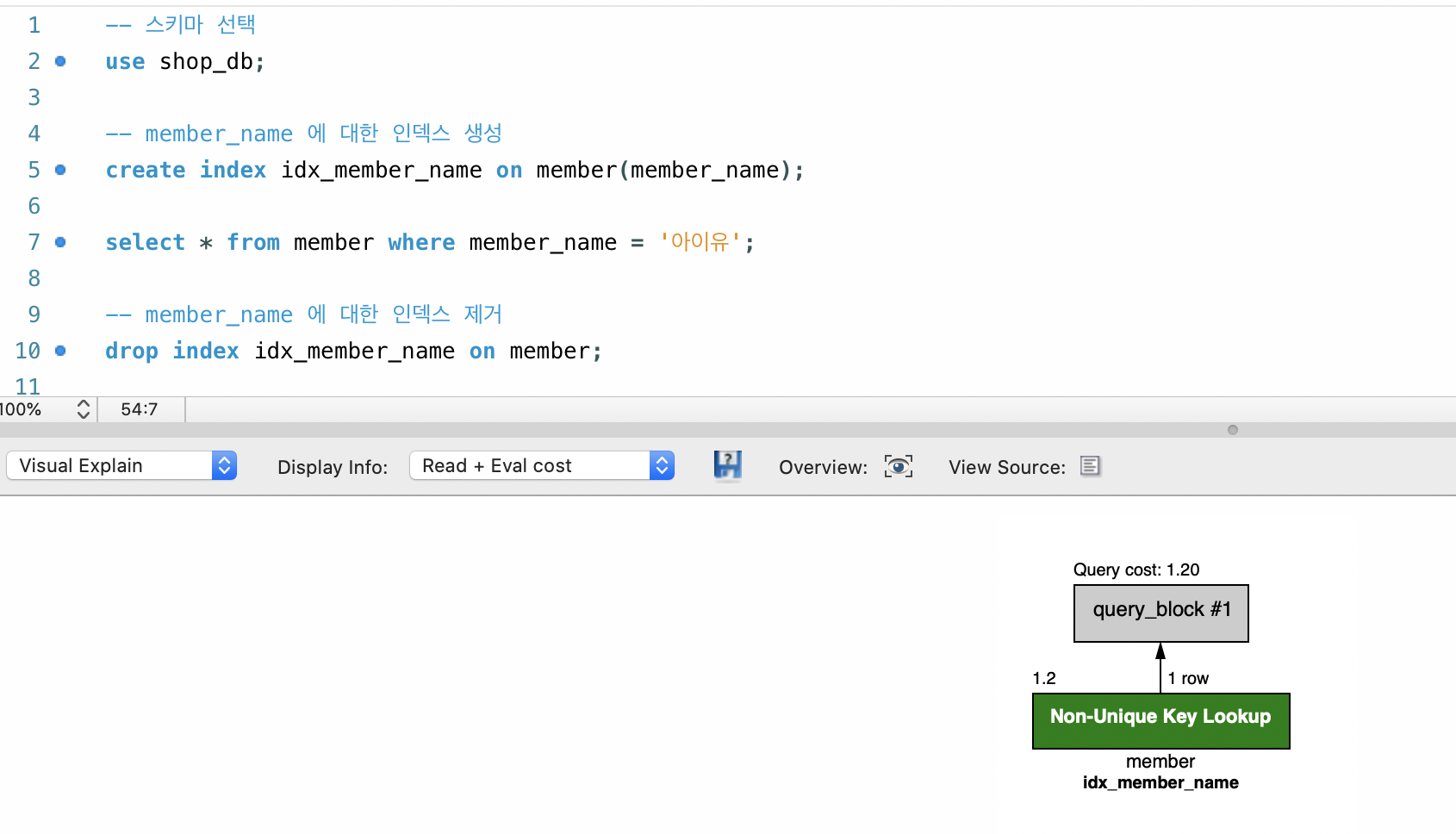 여기에 member_name 열에 대한 인덱스를 지정해보자.